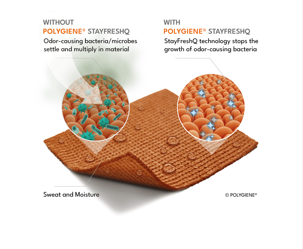 Polygiene StayFreshQ reduces the growth of odor-causing bacteria in textiles. The non-metal technology is integrated into the fabric, so freshness is built-into your products.